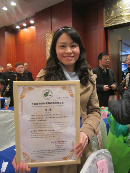 2012年3月21日-24日,中國(guó)衛(wèi)生有害生物防制協(xié)會(huì)2012年年會(huì)暨第四屆三次理事會(huì)在六朝古都南京市隆重召開,康凈公司被授予“中國(guó)有害生物防制服務(wù)機(jī)構(gòu)資質(zhì)A級(jí)證書”。年會(huì)是我國(guó)有害生物防制行業(yè)界最具規(guī)模與影響力的年度盛會(huì),屆時(shí),全國(guó)協(xié)會(huì)及會(huì)員單位、外國(guó)協(xié)會(huì)、省市地方協(xié)會(huì)(港臺(tái)協(xié)會(huì))、愛衛(wèi)系統(tǒng)、疾控系統(tǒng)、科研院校、藥械生產(chǎn)與經(jīng)營(yíng)企業(yè)、PCO企業(yè)等有關(guān)人士齊聚一堂,本次會(huì)議以“除四害與愛國(guó)衛(wèi)生運(yùn)動(dòng)——紀(jì)念愛國(guó)衛(wèi)生運(yùn)動(dòng)開展60周年”為主題,并對(duì)2011年通過A級(jí)資質(zhì)考評(píng)的全國(guó)10家PCO公司正式頒發(fā)資質(zhì)證書。圖為(中國(guó)衛(wèi)生有害生物防制協(xié)會(huì))秘書長(zhǎng)楊華林先生、(歐洲有害生物管理業(yè)協(xié)會(huì))總干事Rob Fryatt 先生作報(bào)告,及頒發(fā)證書現(xiàn)場(chǎng)。