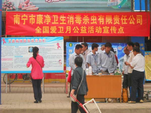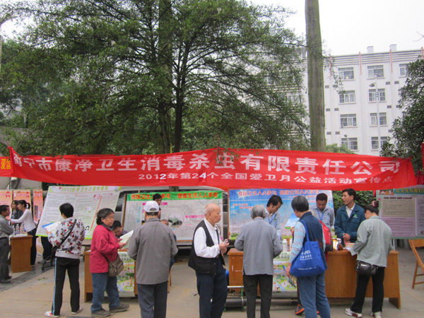 2012年4月6日在南寧市興寧區(qū)政府以及愛(ài)衛(wèi)辦的組織下,康凈公司兩個(gè)組分別在南寧市人民公園和科園西十路,開展2012年第24個(gè)全國(guó)愛(ài)衛(wèi)月公益活動(dòng),圖為愛(ài)衛(wèi)辦領(lǐng)導(dǎo)小組到科園西十路活動(dòng)現(xiàn)場(chǎng)指導(dǎo),以及康凈公司專業(yè)技術(shù)人員在人民公園為廣大市民講解四害相關(guān)知識(shí)。